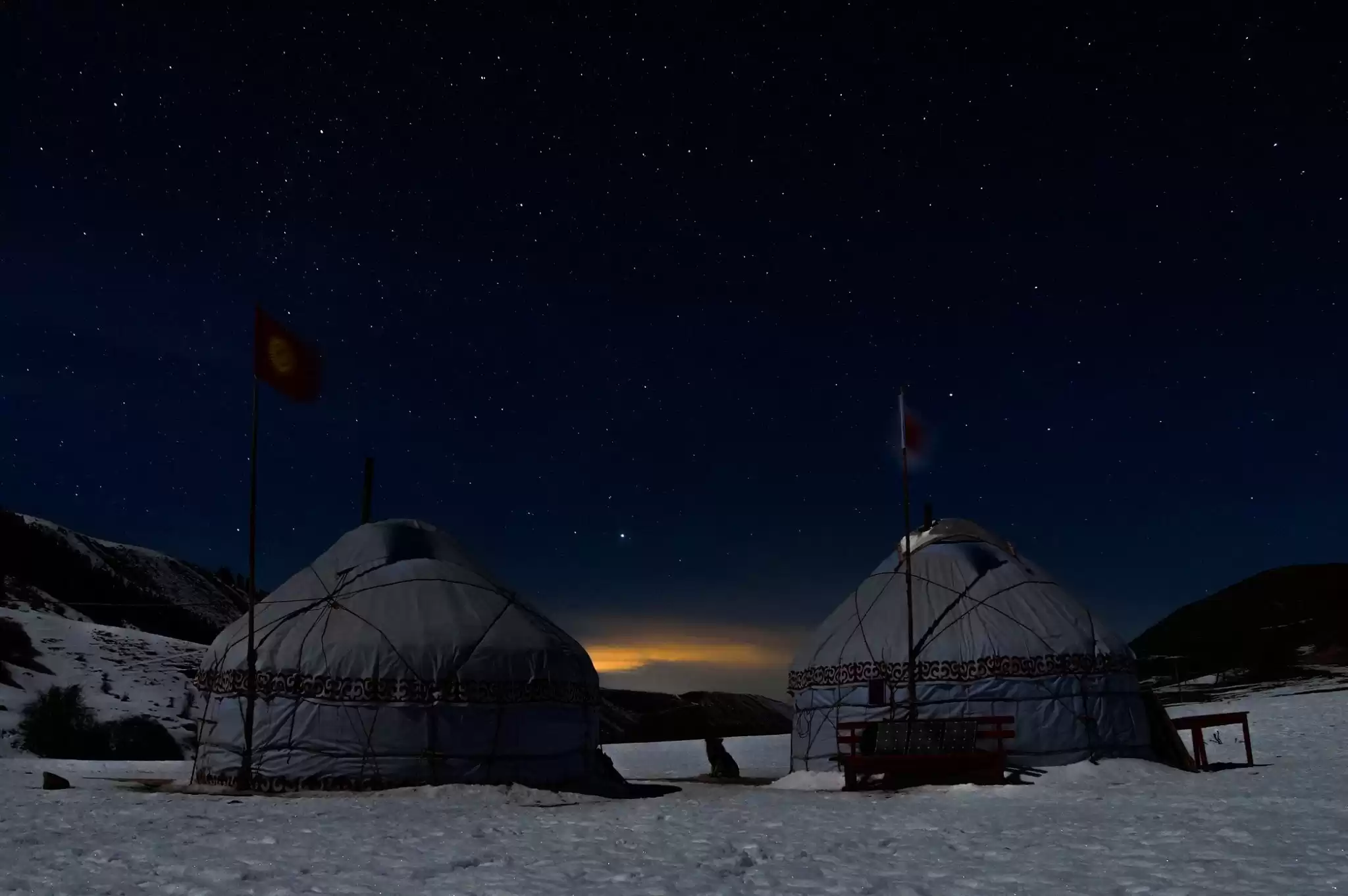 - Asku Valley Ski Touring Yurt Camp which is in the Aksu gorge which is 30 mints from Karakol town is also a great spot to enjoy the high mountains of Kyrgyzstan. They have heated yurts and an outdoor hot tub that is to die for deep in the mountains. If you are snowshoeing or ripping lines in the mountains nearby itâs a must-stop yurt camp. The price is ~85 to 110 dollars per night per person with 3 meals per day.