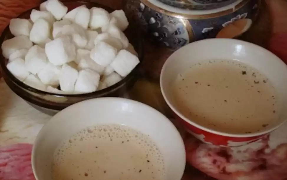 Nogoon sai is Buryat green tea. In cold water shredded green tea is put and boiled, being stirred constantly to remove the bitter aftertaste. The milk is poured and all boiled again, continuously stirred, for 5-7 minutes. Some people drink it slightly salted. Served with ghee and Buryat pies.
